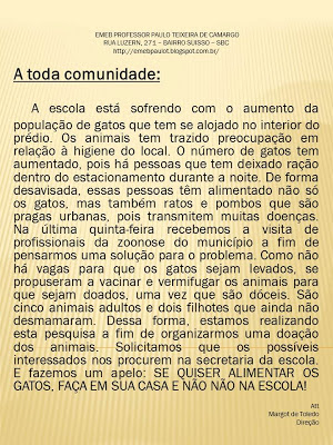 22/05 na EMEB Ramiro Gonzalez, rua Nigéria nº 80, Taboão.